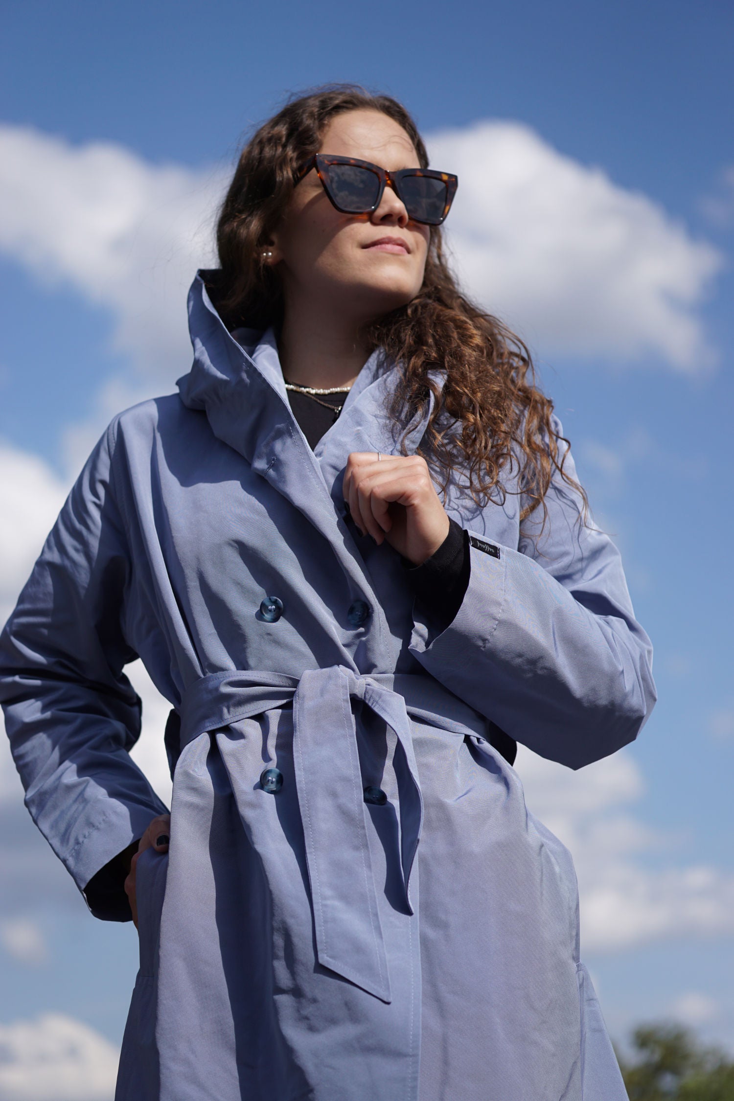 STELLA is a loose cut trenchcoat with shawl collar and integrated hood, waisted when using the included belt. Large enough to be worn with your business outfit.