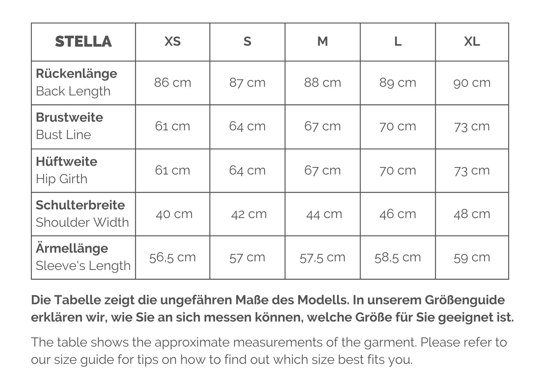 • Our model is 1,63m tall and is wearing STELLA in size M. Approximate sizing: S = 36/38, M = 40, L = 42/44, XL = 46/48