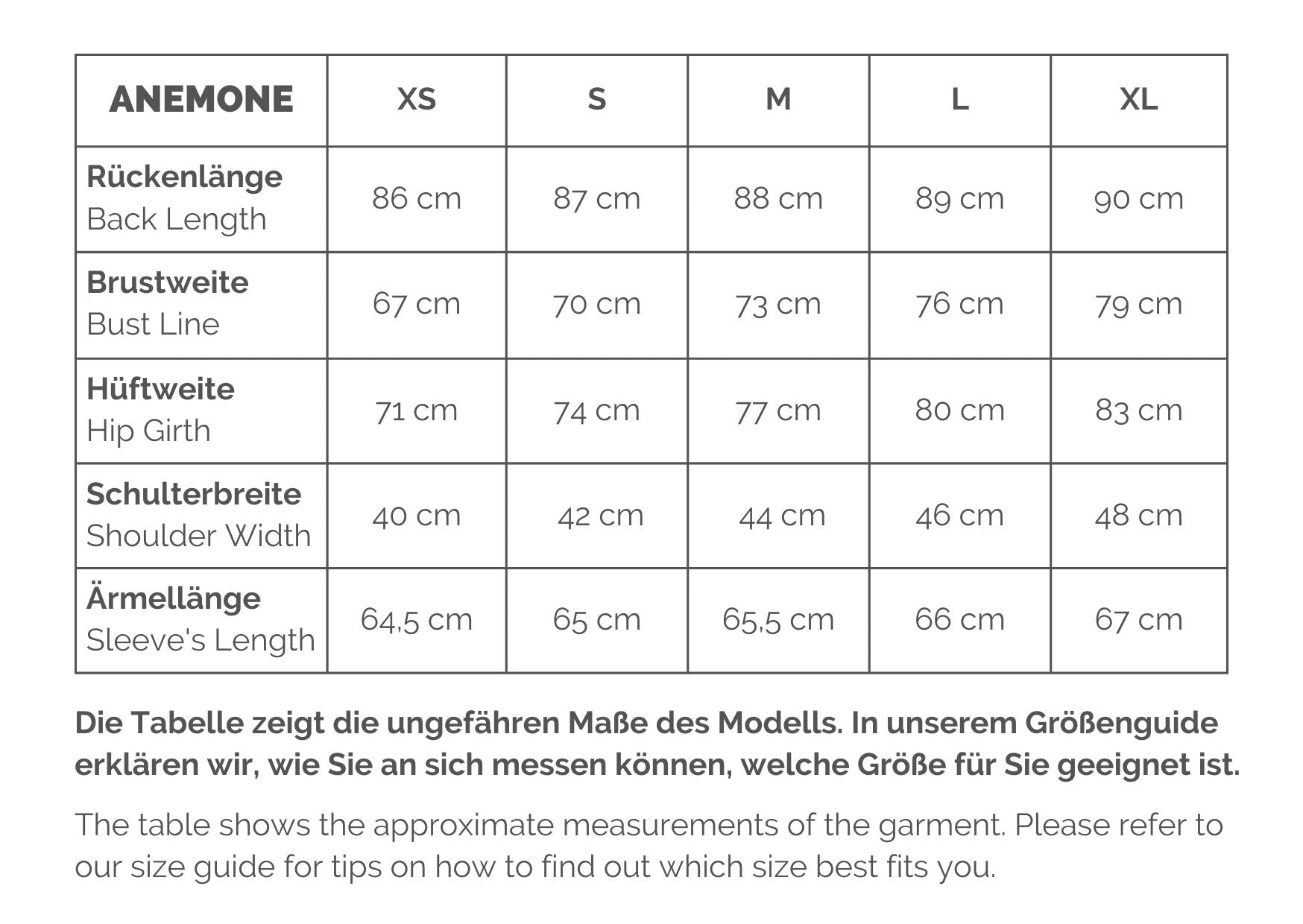 • Passform: ANEMONE ist weit geschnitten und soll locker fallen. Wenn die Schulternaht am richtigen Platz sitzt und der Stoff weit fällt, ist die Größe perfekt!