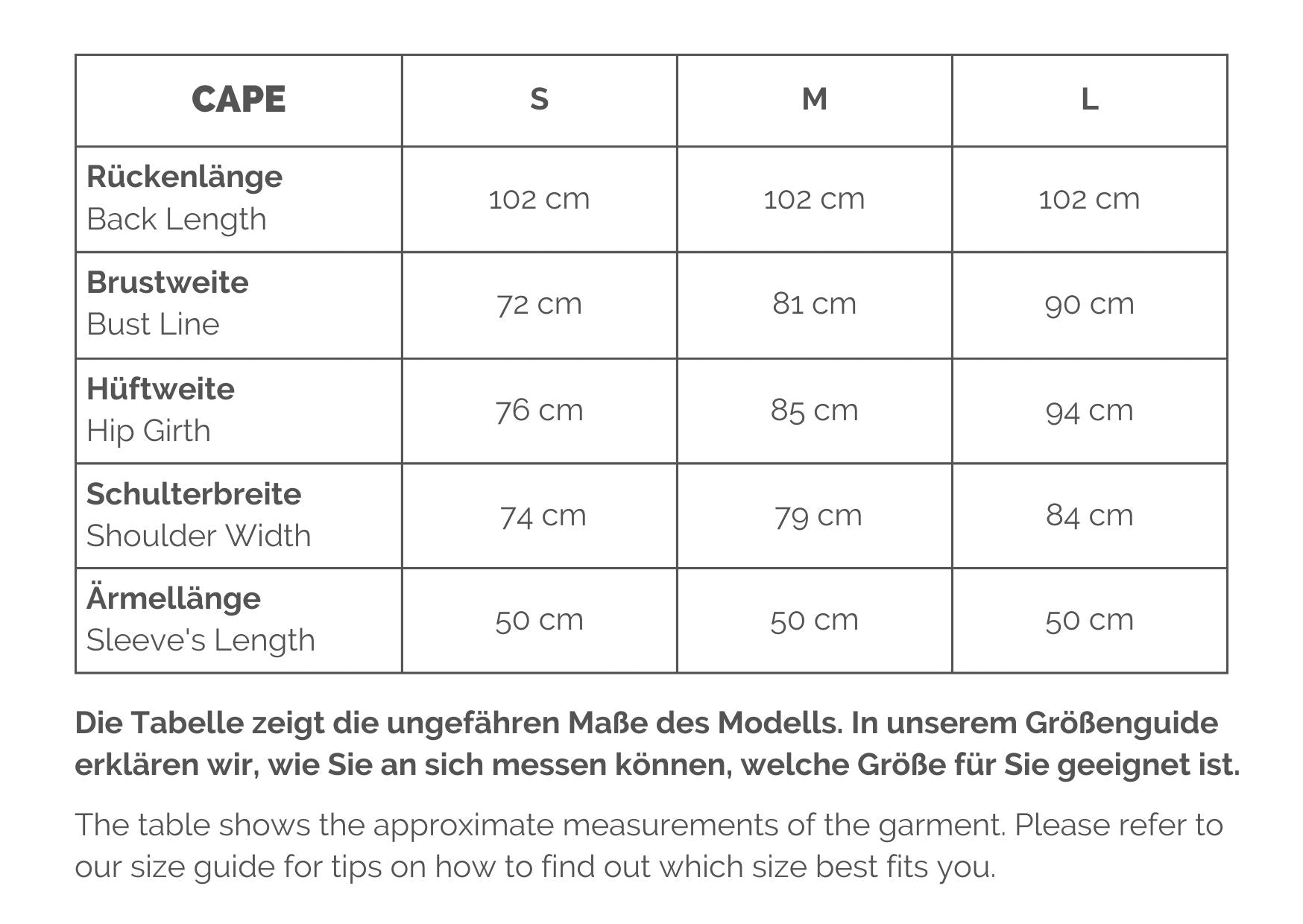 • Passform: CAPE ist bewusst oversized geschnitten und soll weit fallen. Wenn die Schulternaht tief sitzt und der Stoff locker fällt, ist die Größe perfekt!