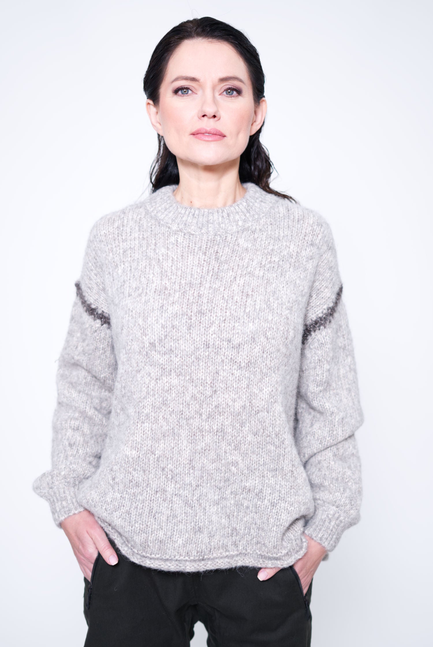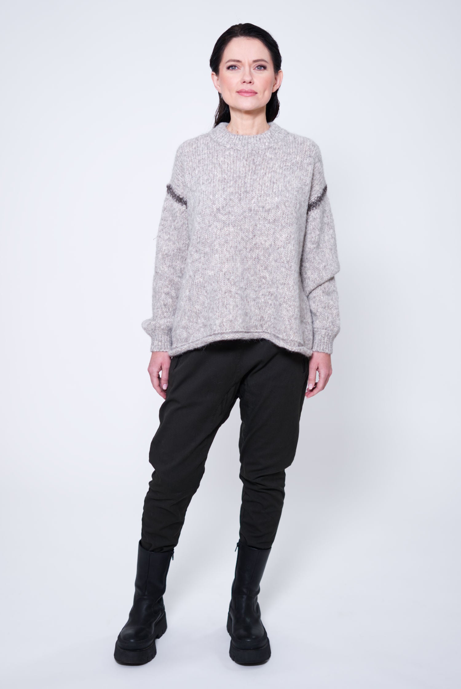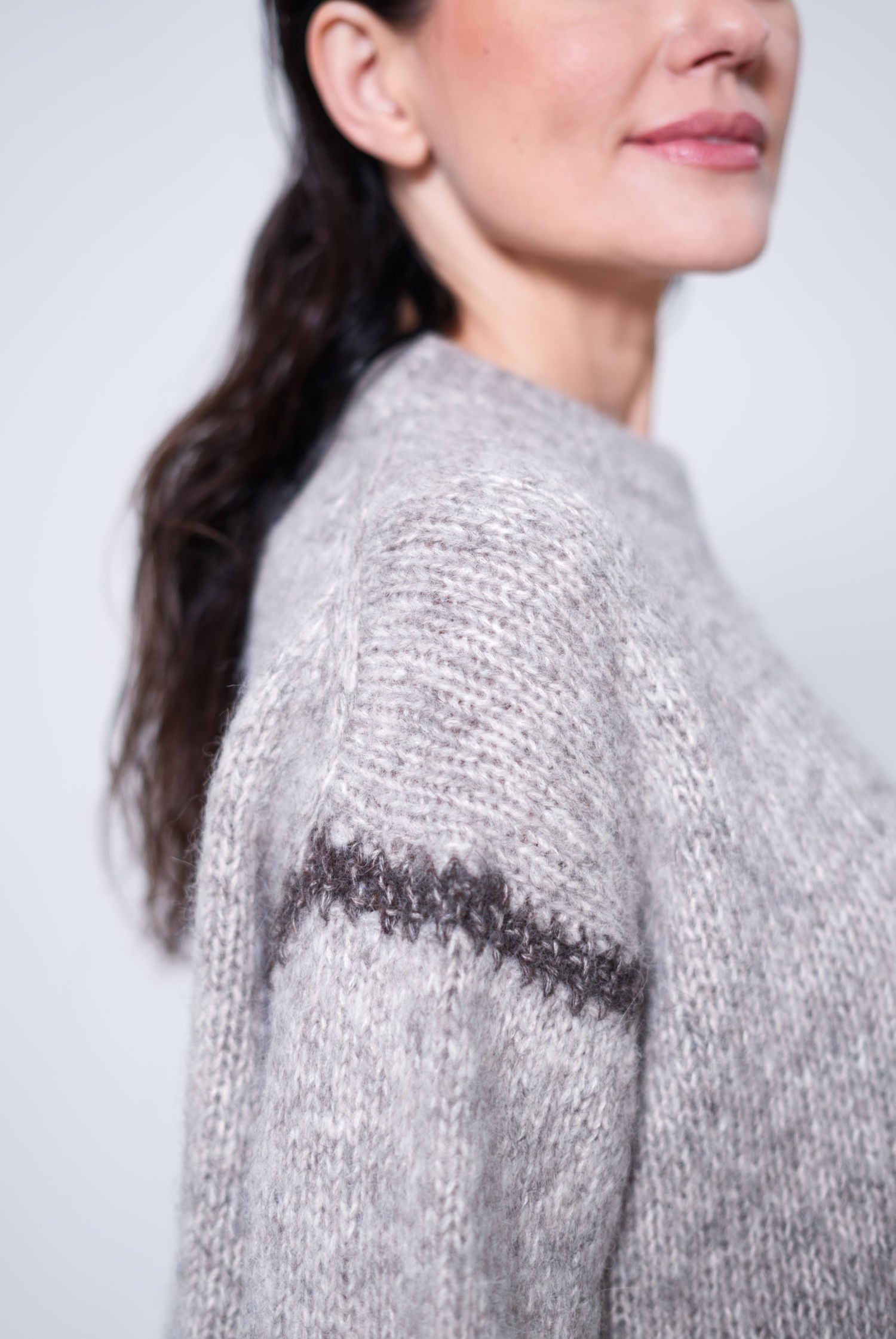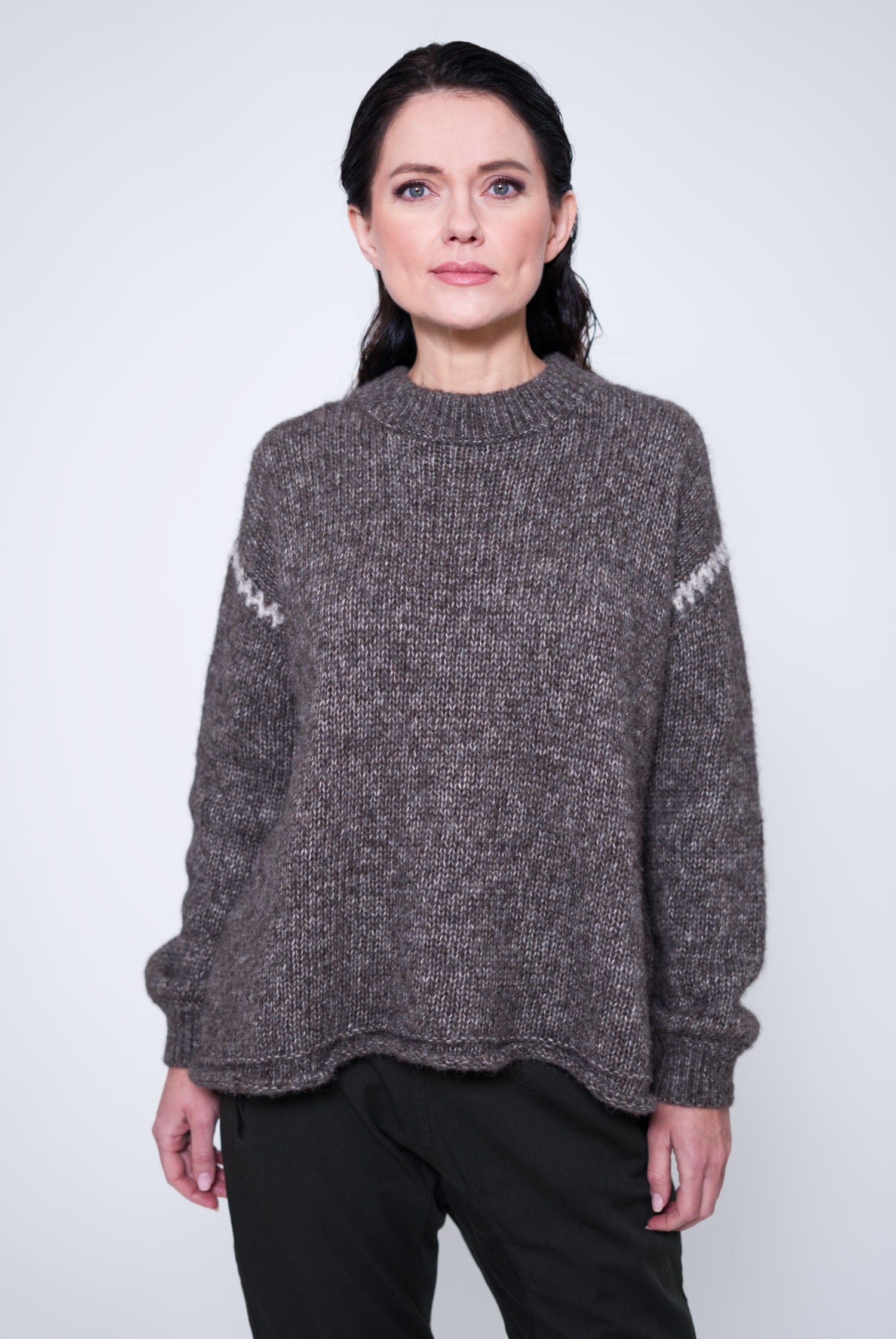 • LEANE ist ein flauschiger, nach unten leicht ausgestellter Strickpullover mit Rundhalsausschnitt, tiefsitzenden Ärmeln und dekorativer Häkelnaht.