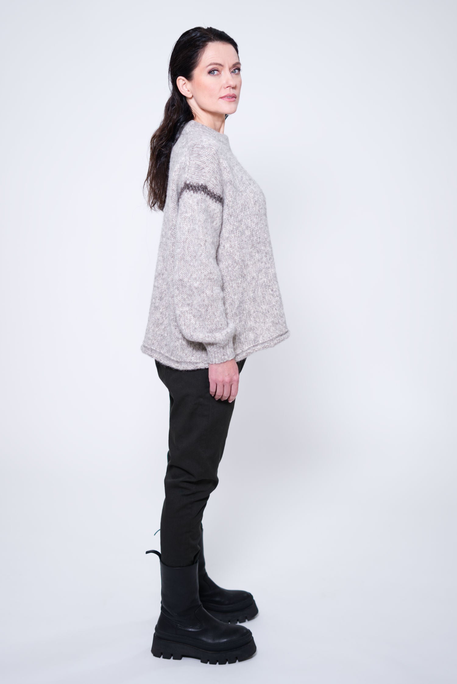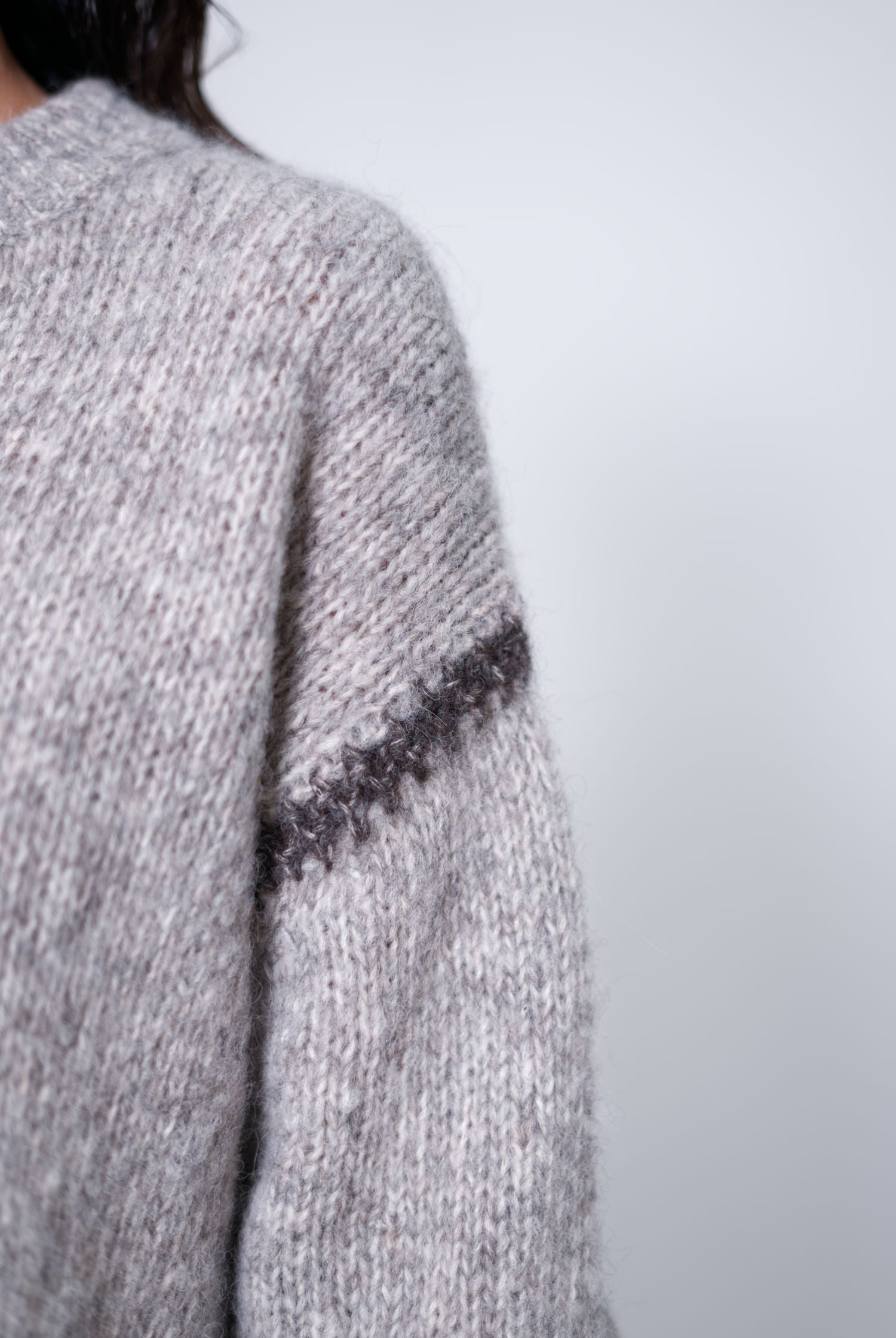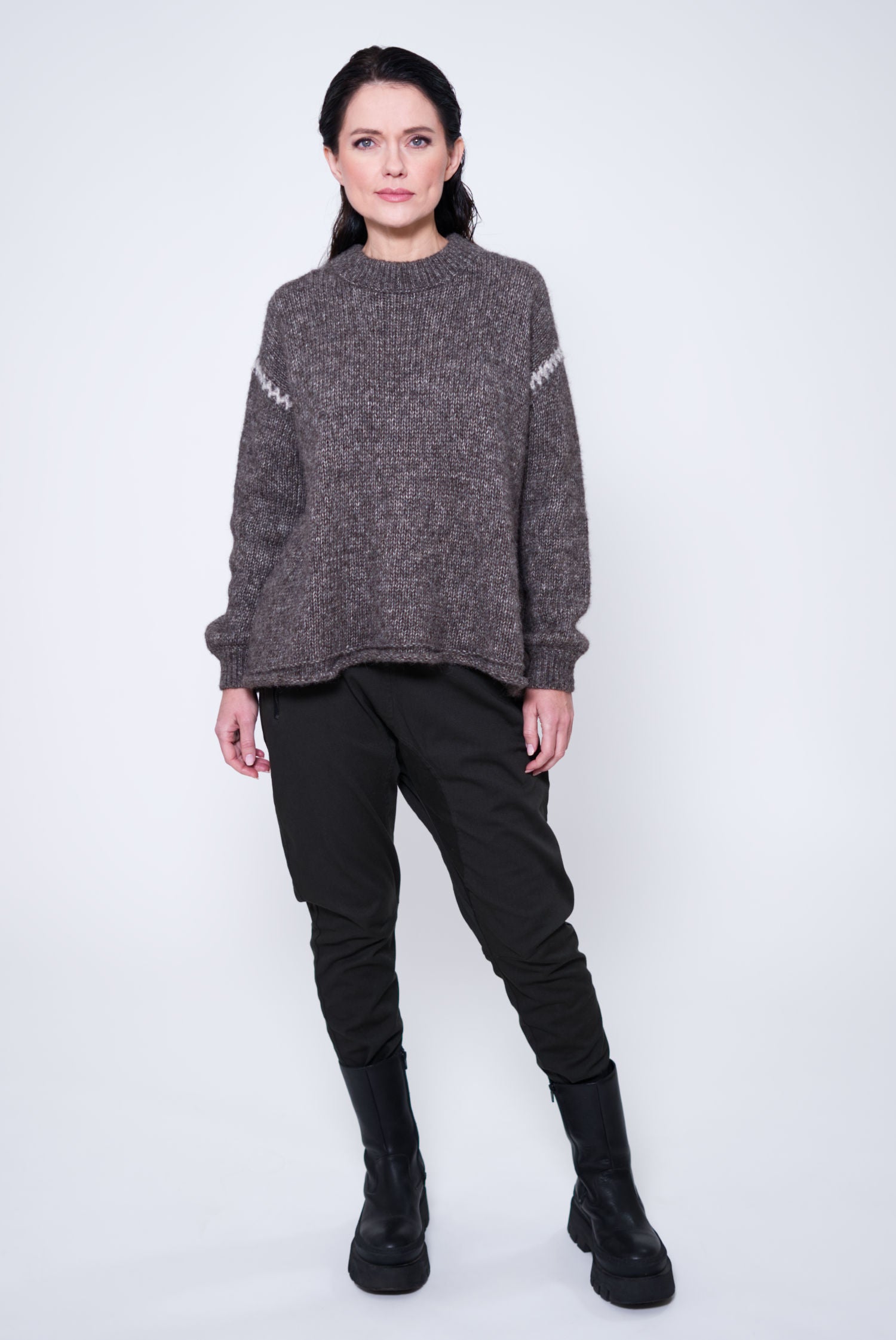 • LEANE ist ein flauschiger, nach unten leicht ausgestellter Strickpullover mit Rundhalsausschnitt, tiefsitzenden Ärmeln und dekorativer Häkelnaht.