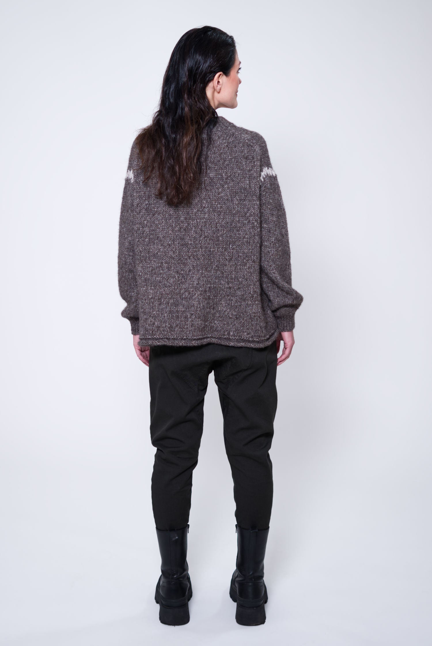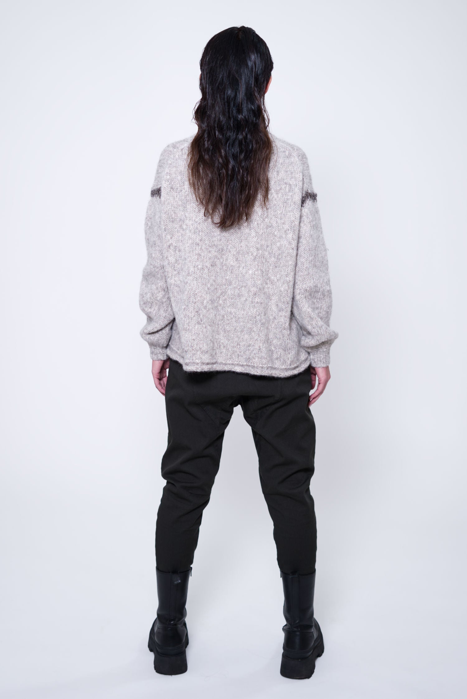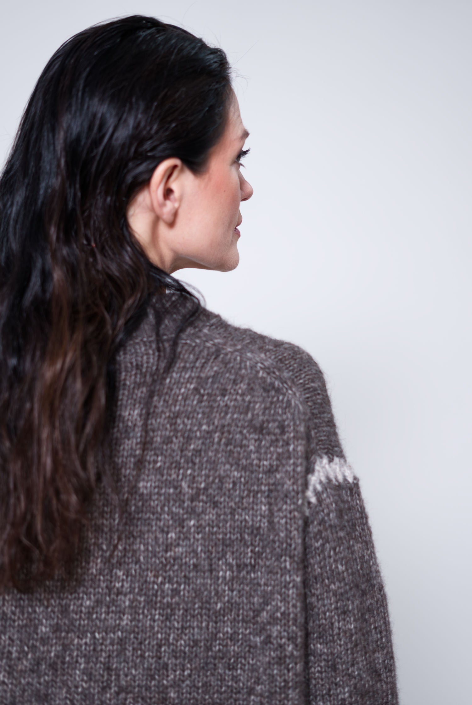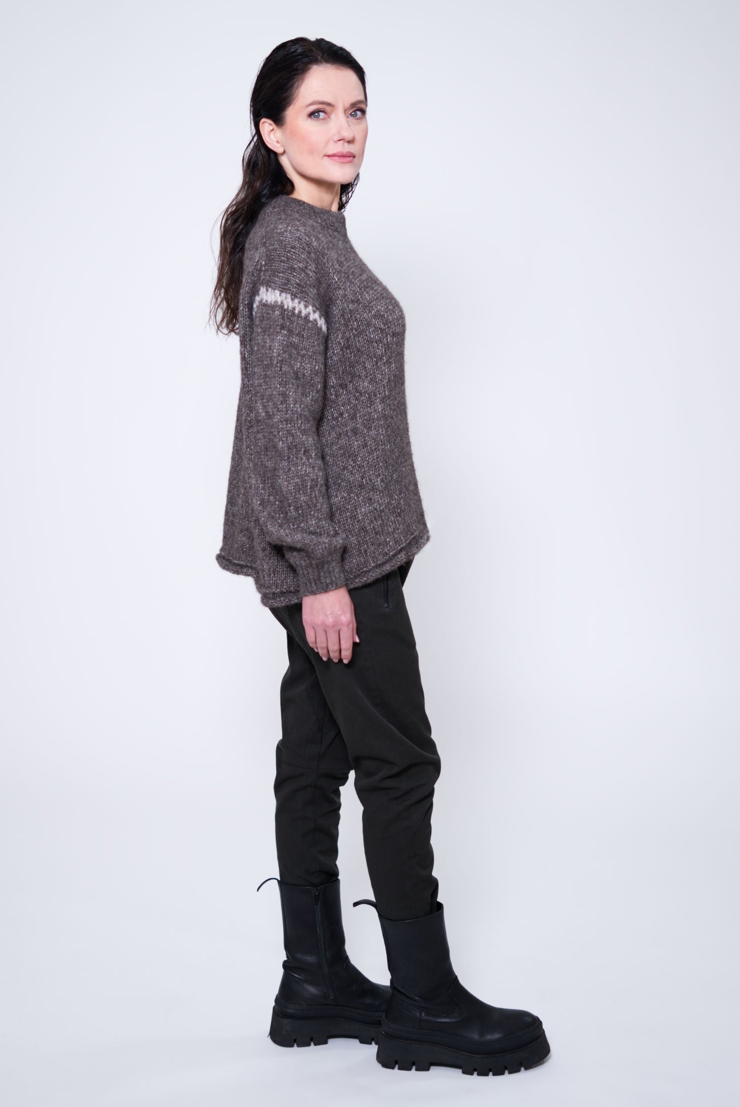 • LEANE ist ein flauschiger, nach unten leicht ausgestellter Strickpullover mit Rundhalsausschnitt, tiefsitzenden Ärmeln und dekorativer Häkelnaht.