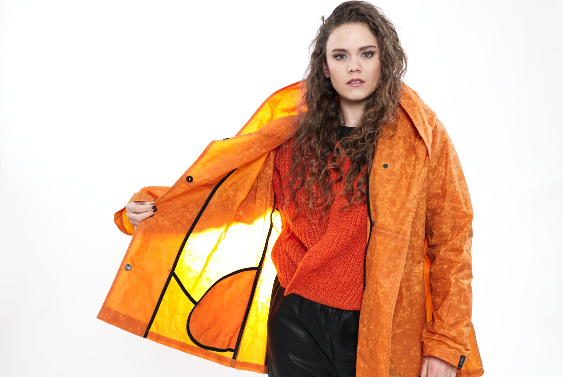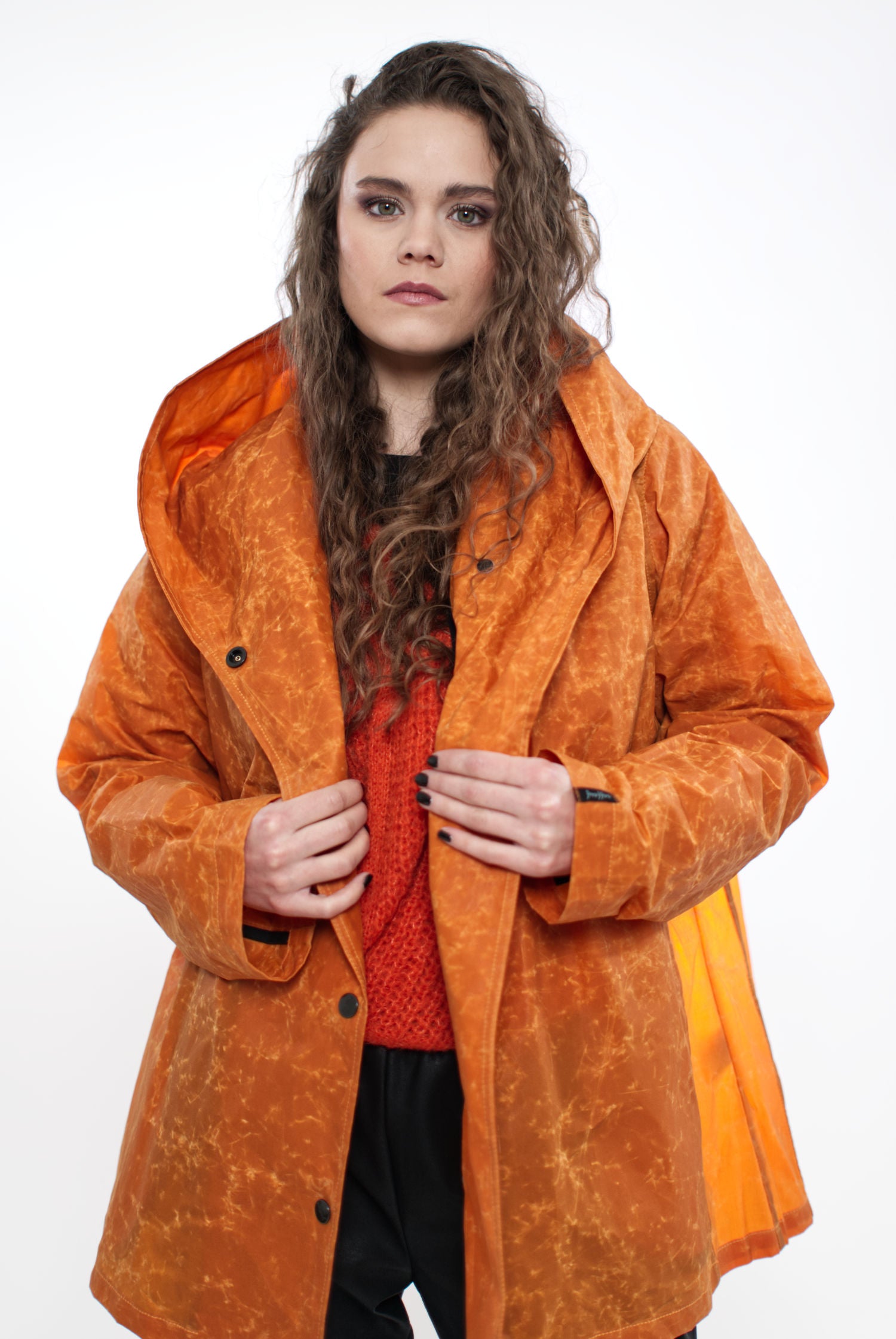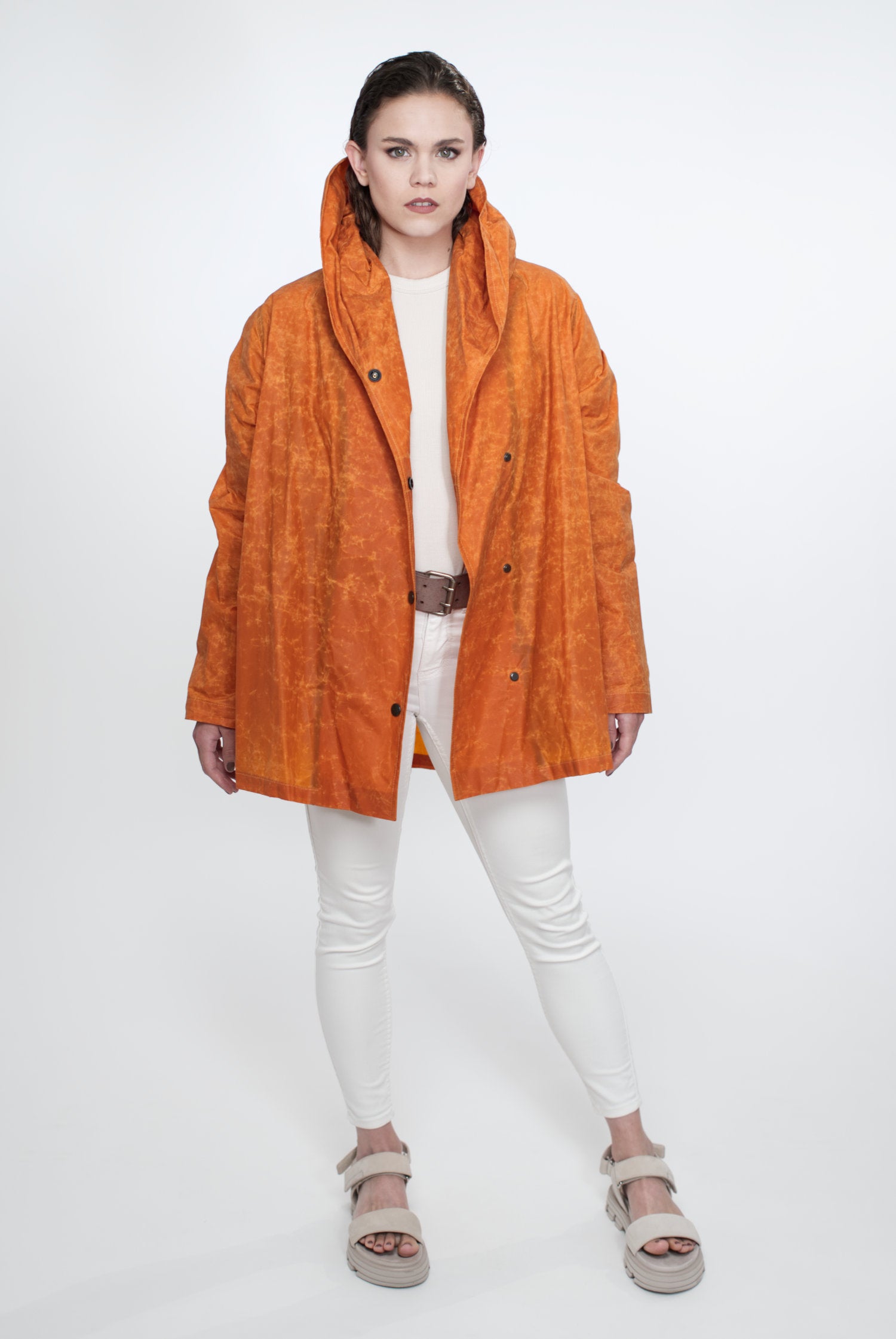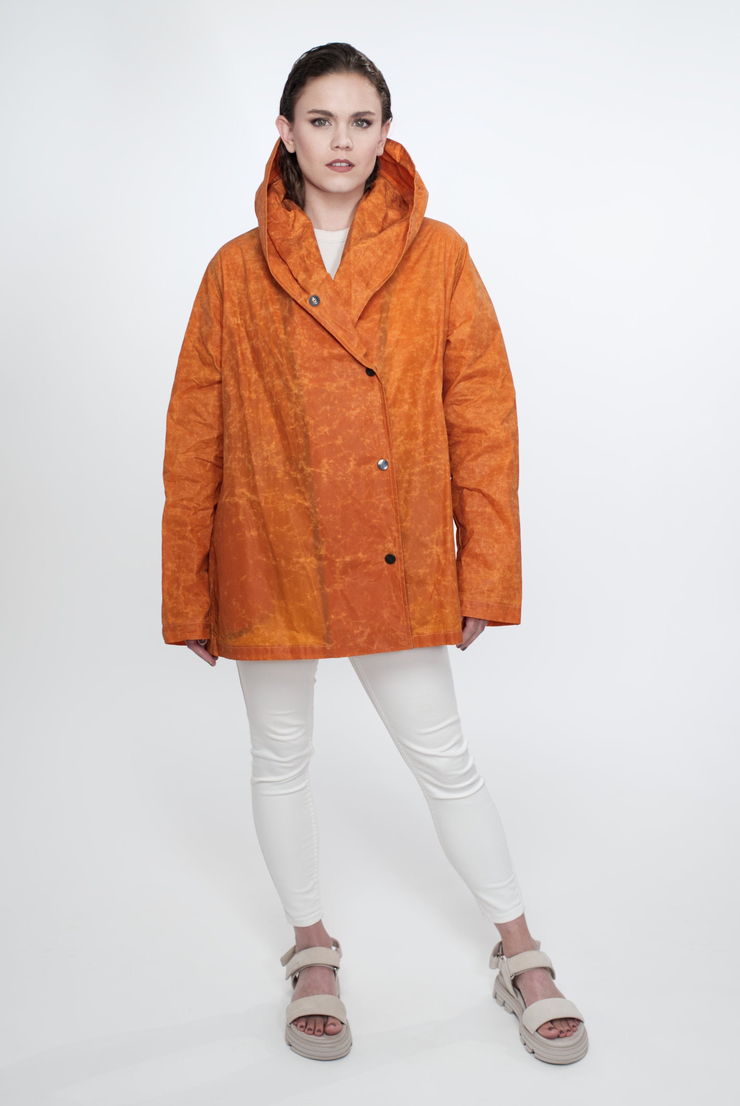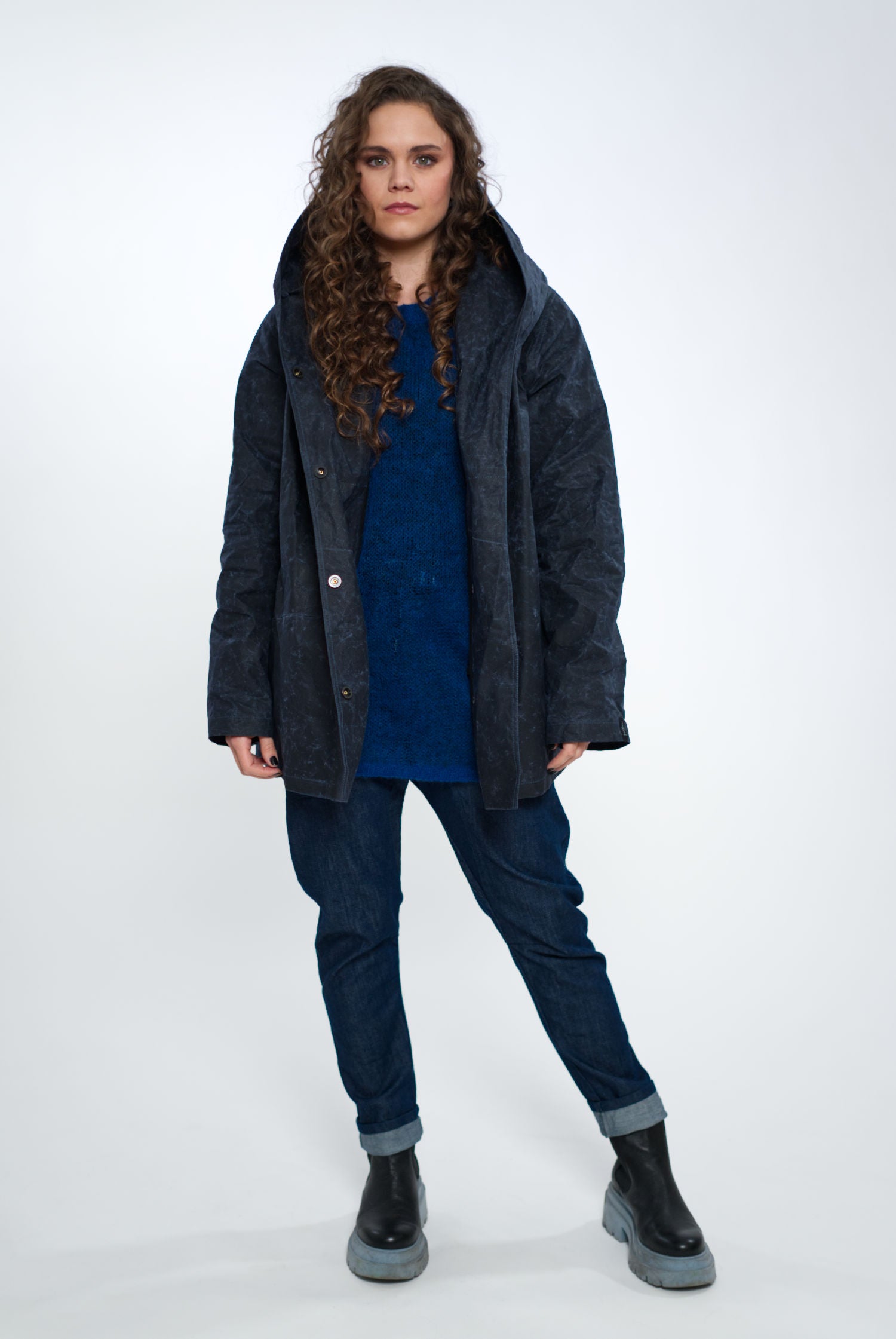 Ein echter Hingucker: VIOLA mit Bienenwachsbeschichtung ist eine facettenreiche und nachhaltige Designerjacke. Die Kurzjacke mit Schalkragenkapuze in A-Linie eignet sich perfekt als ständige Begleiterin für das ganze Jahr.
