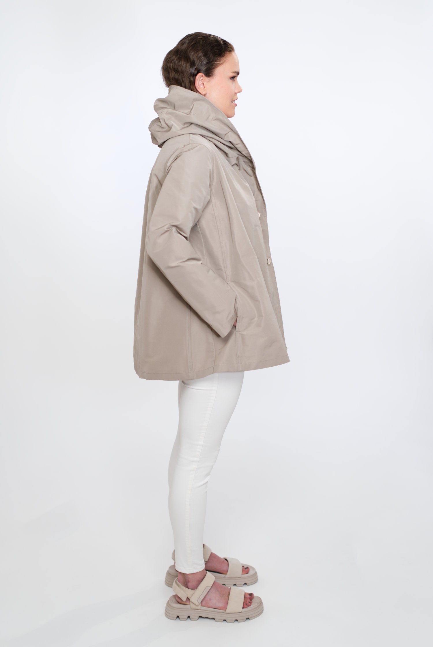 Jacke und Blazer in einem: VIOLA ist eine facettenreiche und nachhaltige Designerjacke. Die Kurzjacke mit Schalkragenkapuze in A-Linie eignet sich perfekt als ständige Begleiterin – drinnen und draußen.